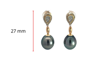 Aretes colgantes de diamantes y perlas de Tahití de oro amarillo de 14 quilates con cierre trasero de mariposa