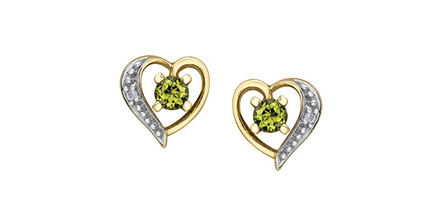 Aretes con forma de corazón de diamantes y peridoto en oro amarillo de 10 quilates