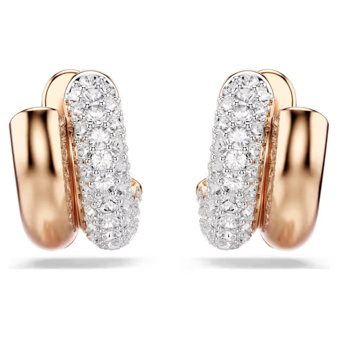 Embodying the industrial style of Dextera, these tubular earrings combine a gleaming rose gold-tone plated surface with a pavé of clear crystals on one side. An additional spring plate mechanism ensures each piece is easy to take on and off. Wear these mini hoops as a distinctive choice for your day to night styling.