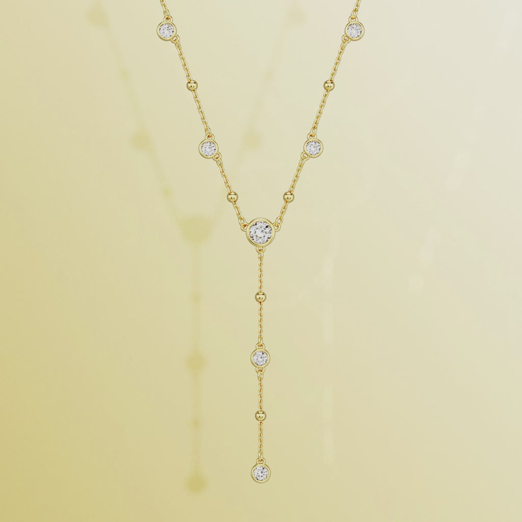 With its distinctive shape, this Imber necklace makes a perfect addition to your jewellery. The design features a 18k gold plated chain, accented with an array of shiny metal droplets and dazzling round-cut crystals in a puffy bezel setting. A delicate strand drops elegantly in the middle, while a single Swarovski Zirconia is placed in the elongation for added luxury. Pair this piece with some Imber earrings for an eye-catching style match.