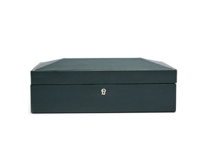 - Disponible en verde con dorado o negro con herrajes de bronce
