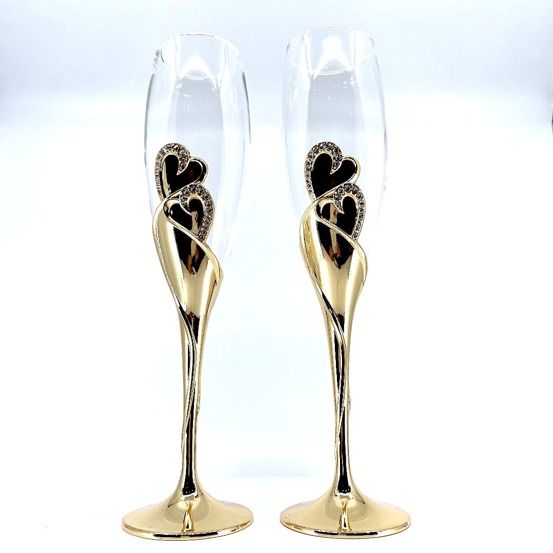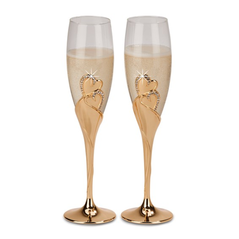 2 copas de champán en tono dorado con diseño de corazón eterno