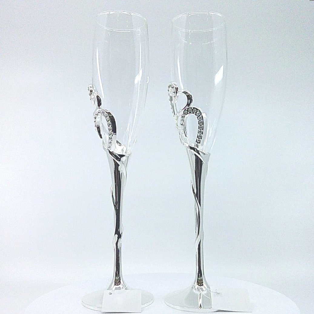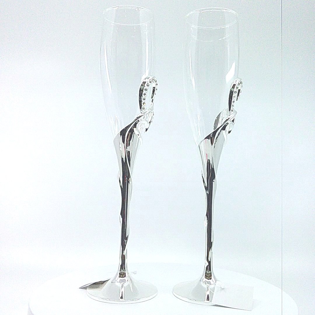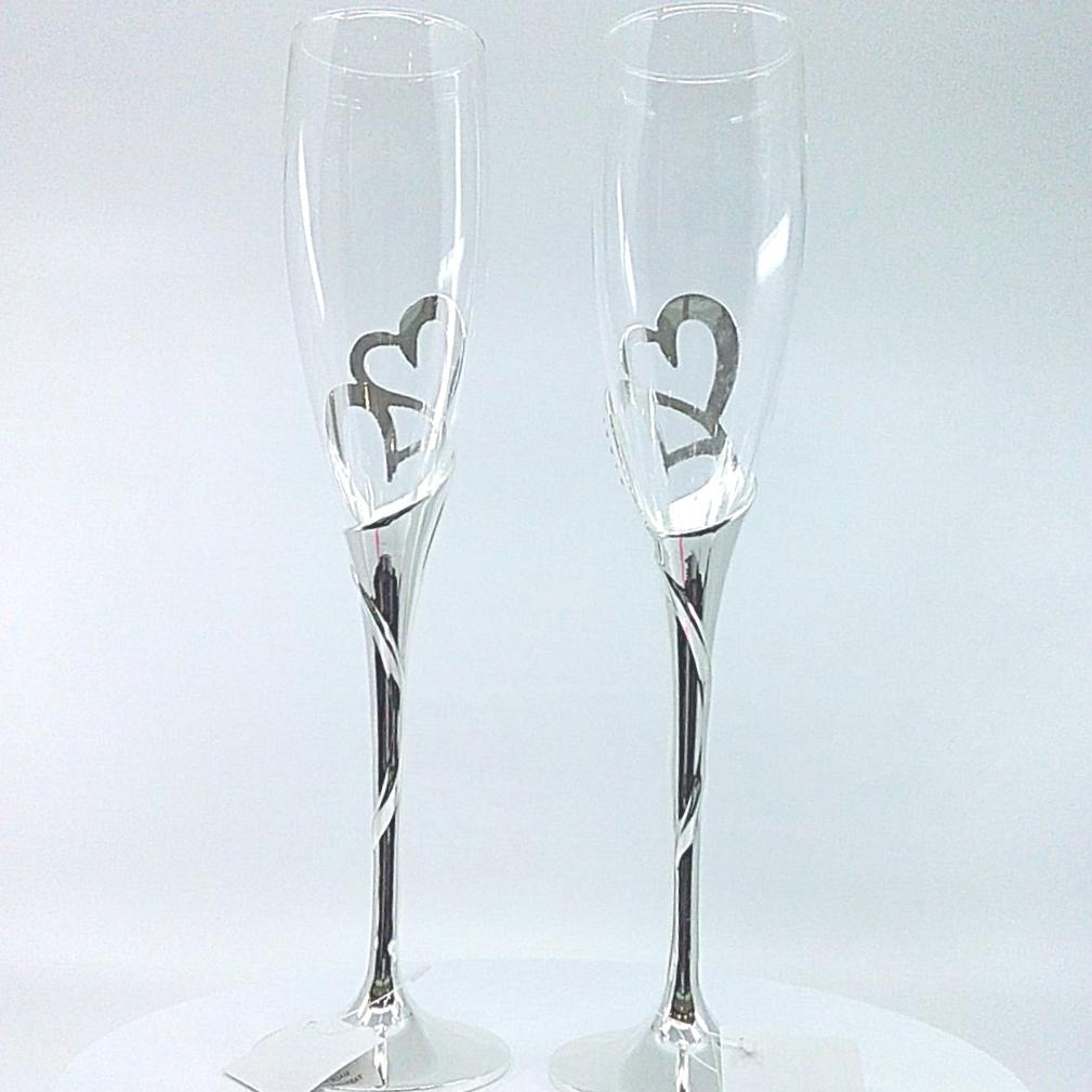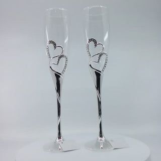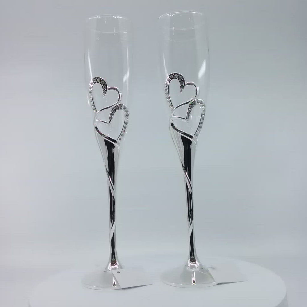 Este juego de champán con doble corazón en plata satinada es ideal para esa ocasión especial. Es el regalo perfecto para personalizar y añadir ese toque único de sentimiento.