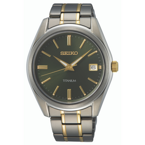 | Reloj Seiko para hombre SUR377 con caja de titanio gris y pulsera de titanio gris con detalles chapados en oro. Un bisel de titanio gris con esfera verde, manecillas luminosas en tono dorado e índices de hora. Marcadores de minutos alrededor del borde exterior. Visualización de la fecha en la posición de las 3 en punto. Movimiento de cuarzo Seiko calibre 6N52. Cristal de zafiro resistente a arañazos. Tirar/empujar la corona. Un fondo de caja sólido con un tamaño de caja de 40 mm. Cierre triple con botón de liberación. Resistente al agua a 100 metros. Funciones: fecha, hora, minuto, segundo. Movimiento japonés. Garantía Seiko de 3 años |