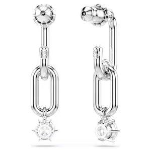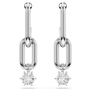 These playful earrings are a perfect choice for unexpected styling. Each piece features two interconnecting links in rhodium plating with a prong-set Swarovski Zirconia that delicately hangs beneath. It’s a sleek, metallic look for any occasion, with an extra burst of Swarovski light.