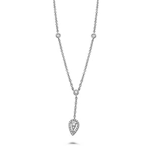 When you want an elegant gift (even if it is for yourself). This elegant Y necklace has a chain punctuated with three bezel-set diamonds that ends with a pear-shaped, haloed pendant of pave diamonds. Total weight of diamonds: .15 carat.